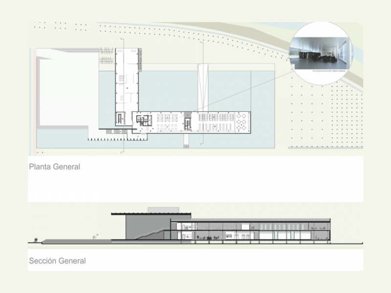 Mientras que el edifico de equipamientos complementario al Parque-Bosque de la Vega del Genil, se vuelca en el contacto hacia el río y el agua.