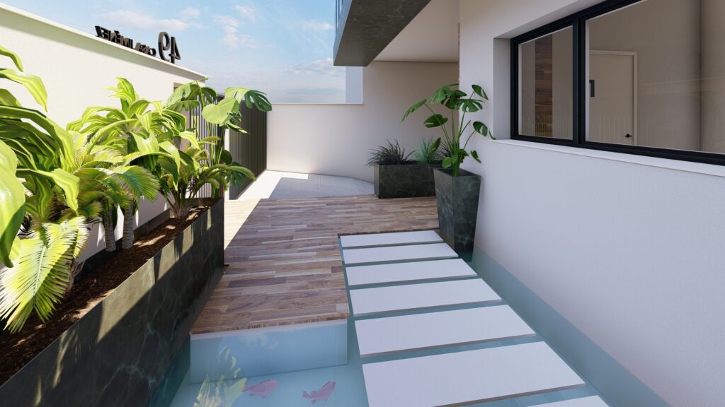 Patio panorámico piscina y estanque koi