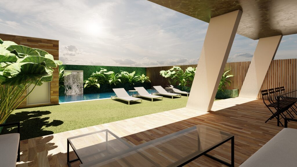 - Cocina-comedor-sala estar abierta conexión visual terraza cubierta + patio-piscina.