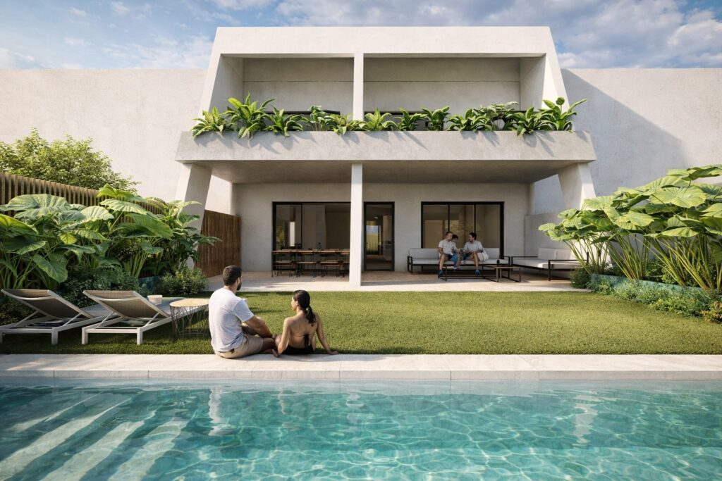 - 2 dormitorios cadetes simétricos (15 m²): estudio, ventilación cruzada, balcones dobles.